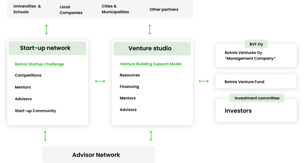 Venture Studio provides the support of the Advisory Network which is formed from the expertise in and around Ostrobothnia: Universities, Institutions, Local Companies, Entrepreneurs, Investors and Expert Advisers.